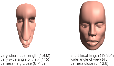 • Une courte longueur focale représente un grand angle de vue (par exemple, une caméra objectif grand angle). Les objets qui sont proches de la caméra apparaissent petits ou loin. Les objets qui sont très proches de la caméra peuvent apparaître beaucoup de grandes par rapport aux objets qui sont légèrement plus loin de la caméra.