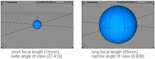 • Une longue focale représente un angle étroit de vue (par exemple, un télescope ou un objectif de caméra). Les objets éloignés de la caméra, apparaissent grands ou fermer pour la caméra.