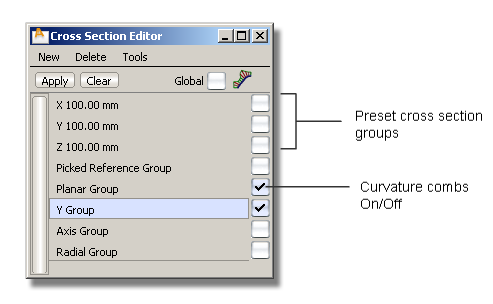 À droite de chaque section Nom du groupe est une case à cocher qui vous permet d'afficher ou de masquer les peignes de courbure sur les coupes lorsque les objets sont sélectionnés.