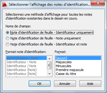 Dans la boîte de dialogue Sélectionner l'affichage des notes d'identification de référence ou Sélectionner l'affichage des notes d'identification de feuille, activez l'option de votre choix dans la section Noms de champs. Si vous optez pour Identificateur et note, vous pouvez également sélectionner une option dans la liste déroulante Format note d'identification. Il est possible de changer le paramètre Format quelle que soit l'option activée dans la section Noms de champs.