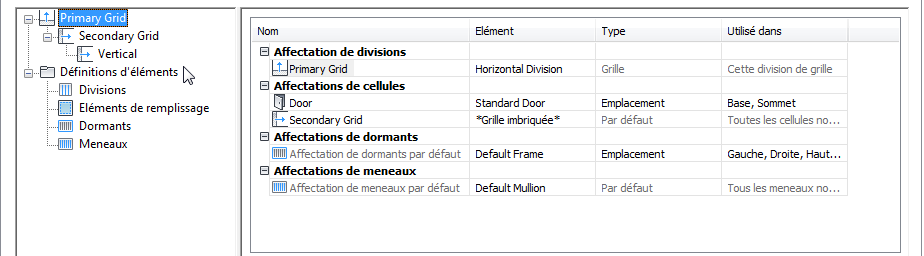 Chaque grille est dotée de ses propres affectations de cellules. Les affectations de cellules peuvent être définies pour inclure dans les cellules une autre grille, un élément de remplissage de panneau ou un objet tel qu'une fenêtre ou une porte.