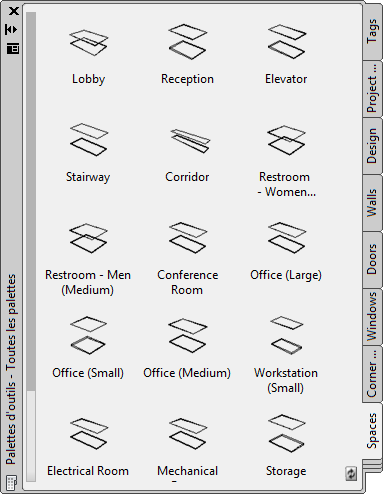 Les palettes personnalisées créées par votre gestionnaire CAO ou d'autres utilisateurs peuvent également contenir des outils d'espaces avec des propriétés et des styles personnalisés en fonction de vos projets ou de vos normes professionnelles.