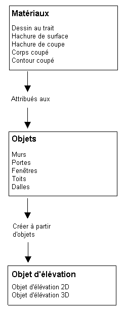 Les objets élévation 2D et 3D sont composés d'un certain nombre de composants d'affichage qui peuvent être déterminés par des matériaux. L'affectation de matériaux à un objet revient à affecter un matériau à chacun des composants d'affichage de cet objet. Vous pouvez, par exemple, affecter le matériau bois au dormant d'une fenêtre et le matériau vitre à un encart de vitre.