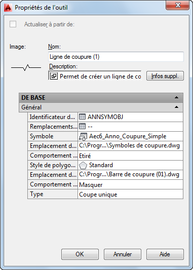 - Les outils de ligne de coupure doivent disposer d'éléments de prise en charge dans le dessin contenant le symbole de ligne de coupure. Comme dans le cas des outils à plusieurs composants tels que les étiquettes de nomenclature, leur modification ultérieure en sera simplifiée. Toutes les propriétés des symboles de coupe sont définies dans les propriétés d'outils, que les symboles de coupe masquent/ajustent ou non les objets.