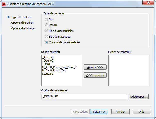 - Utilisez l'Assistant Création de contenu AEC afin de créer des outils pour les cotes AutoCAD standard. Ainsi, à l'aide de l'option Commande personnalisée et des identificateurs de calques, vous pourrez vérifier que les cotes sont placées sur le calque adéquat.