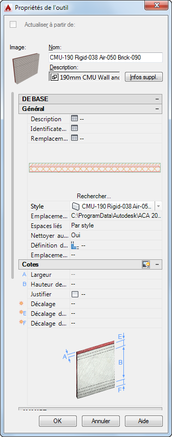 Le style de mur lui-même est le seul style basé sur des murs que vous pouvez affecter à un outil de palette. Néanmoins, lorsque vous utilisez le style de mur, les sous-styles qui lui sont associés, comme les styles d'extrémités de murs et les styles d'extrémités d'ouvertures de murs, sont automatiquement importés avec lui. Par ailleurs, il existe certaines propriétés d'outil qu'il est préférable de définir par défaut avant d'enregistrer l'outil dans un catalogue :