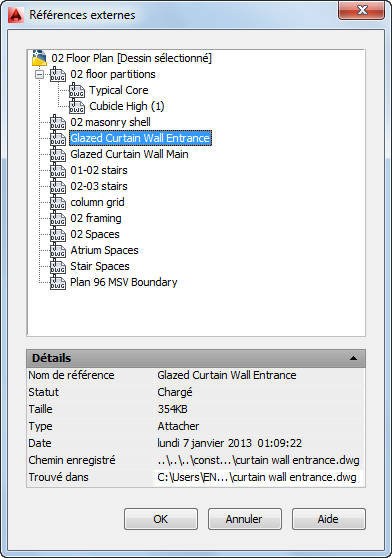 La boîte de dialogue Références externes répertorie les Xréfs de la construction.