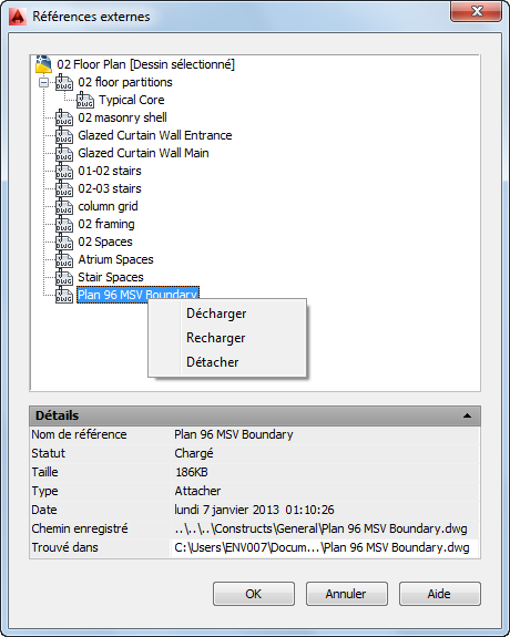 A partir du menu contextuel, vous pouvez décharger, recharger ou détacher la Xréf attachée.