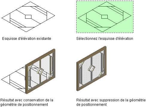 Cette procédure permet de créer une esquisse de grille personnalisée à l'aide de lignes, d'arcs et de cercles, puis de convertir ce dessin au trait en un bloc porte/fenêtre.
