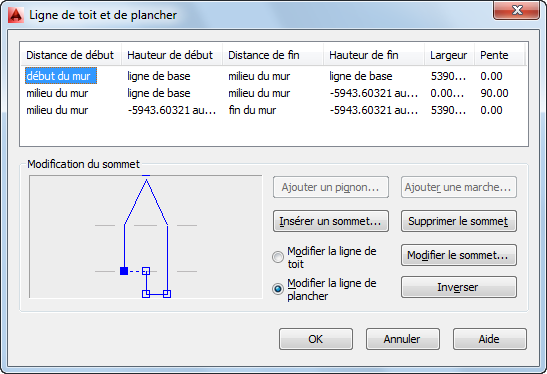 Le tableau figurant dans la partie supérieure de l'écran affiche les informations relatives à chaque sommet du mur-rideau. Vous pouvez choisir le sommet à modifier dans la liste.