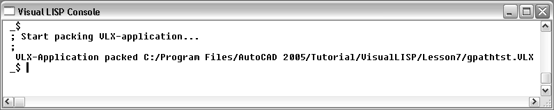 The Visual LISP Console window displays messages relating to the creation of the application executable, the .vlx file. If the Make Application process succeeds, the Console window displays the folder path and file name of the .vlx, as in the following example: