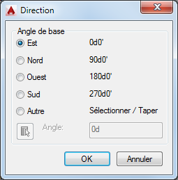 Définit la direction de l'angle zéro. Les options suivantes affectent l'entrée des angles et l'entrée des coordonnées polaires, cylindriques et sphériques.