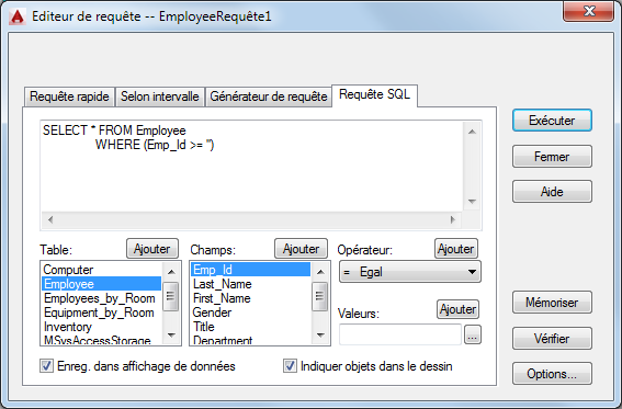 Propose un espace permettant de taper une requête SQL de format libre ou d'ajouter les éléments sélectionnés à l'aide des différents outils Requête SQL.