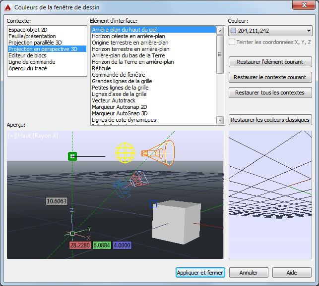 Rétablit les paramètres de couleur classiques d'AutoCAD 2008 pour les éléments d'interface de l'espace objet 2D uniquement.