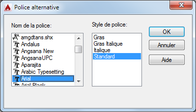Si vous n'indiquez pas une autre police lorsque vous ouvrez un dessin contenant des polices impossibles à localiser, une boîte de dialogue s'affiche et vous permet d'indiquer une police à utiliser en remplacement de chaque police manquante.