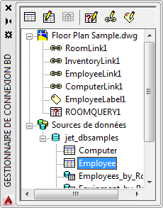 Le Gestionnaire de connexion BD est une fenêtre contenant un jeu de boutons et une arborescence qui peut être ancrée et redimensionnée. Il permet d'ouvrir la fenêtre Affichage des données afin de visualiser ou de modifier une table de base de données. Vous pouvez également associer divers objets de base de données (gabarits de liens, d'étiquettes et requêtes, etc.) avec un dessin.