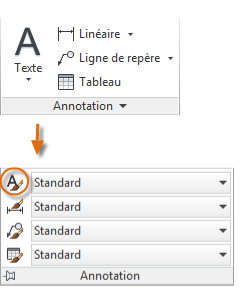 Tout comme d'autres fonctions d'annotation, le texte multiligne fournit un grand nombre de paramètres. Lorsque vous enregistrez ces paramètres en tant que style de texte à l'aide de la commande STYLE, vous pouvez accéder aux styles de texte que vous avez enregistrés en cliquant sur la flèche déroulante située dans le groupe de fonctions Annotation. Le style de texte courant s'affiche en haut de la liste déroulante.