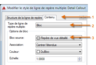 Par exemple, pour créer un style de repère de vue détaillé, exécutez la commande STYLELIGNEDEREPMULT. Dans le gestionnaire des styles de lignes de repère multiples, cliquez sur Nouveau, puis choisissez un nom descriptif pour le nouveau style de ligne de repère multiple. Cliquez sur l'onglet Contenu, sélectionnez Bloc, puis l'option Repère de vue détaillé, comme indiqué.