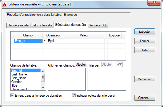Affiche la liste des champs disponibles à partir de la table de base de données courante, dans laquelle vous pouvez choisir les champs à afficher dans la fenêtre Affichage des données lors de l'exécution de la requête. Si vous ne désignez pas les champs à afficher, la requête renvoie tous les champs de la table de base de données. Si vous cliquez deux fois sur un champ de cette liste ou sélectionner un champ, puis sur Ajouter (afficher les champs), vous ajoutez le champ à ceux affichés dans la fenêtre Affichage des données une fois la requête exécutée. Vous pouvez aussi faire glisser des champs dans les zones Afficher les champs et Trier par.