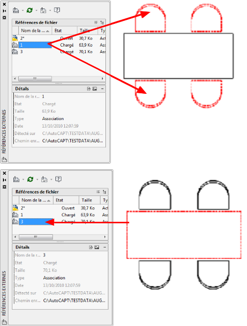 Un fichier de dessin peut être attaché comme xréf à plusieurs dessins en même temps. Inversement, plusieurs dessins peuvent être attachés comme dessins référencés à un même dessin.