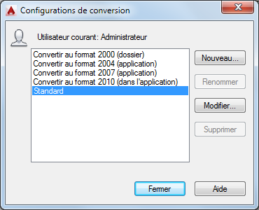 Affiche la boîte de dialogue Modifier la configuration de la conversion, qui vous permet de spécifier des options pour la conversion des dessins sélectionnés.