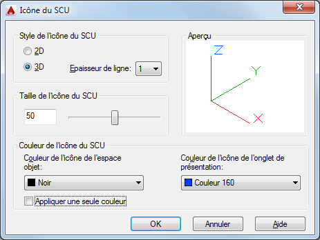 Spécifie l'affichage de l'icône SCU en 2D ou 3D, ainsi que son aspect.