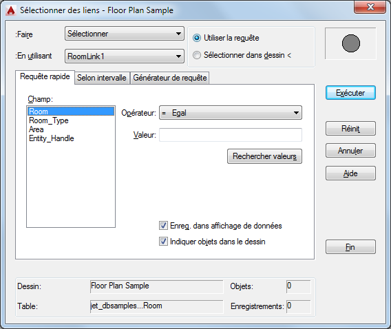 Affiche les informations d'état courantes basées sur l'opération de sélection des liens active. La table et le dessin courants s'affichent, ainsi que le nombre d'objets et d'enregistrements liés qui correspondent aux paramètres spécifiés Sélectionner des liens.