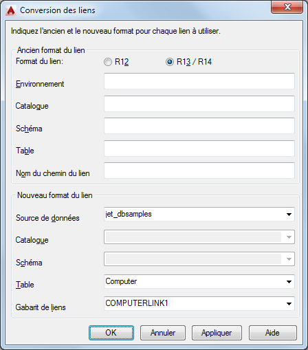 Les liens hérités étant stockés dans des formats très différents de celui d'AutoCAD 2000 et versions ultérieures, le processus de conversion des liens exige que vous établissiez un mappage entre les anciennes valeurs de lien AutoCAD SQL Extension ™ (ASE) et les nouvelles valeurs utilisées par AutoCAD 2000 et versions ultérieures. Par exemple, vous devez identifier l'environnement utilisé par un lien particulier dans la Release 14, et désigner la source de données devant remplacer cet environnement dans AutoCAD 2000 et version ultérieure. Vous devez établir des mappages entre les anciennes valeurs de lien ASE et celles qui doivent les remplacer.