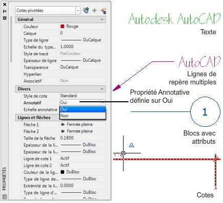 Les objets d'annotation incluent des cotes, des notes et d'autres types de symboles explicatifs ou d'objets couramment utilisés pour ajouter des informations à votre dessin.