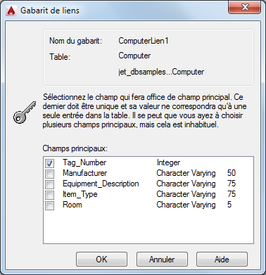 Affiche tous les champs disponibles pour la table de base de données courante, ainsi que le type de champ et, pour les champs de caractères, la longueur de champ. Pour spécifier les champs clés du gabarit de liens, sélectionnez la case à cocher située à gauche du nom de champ.