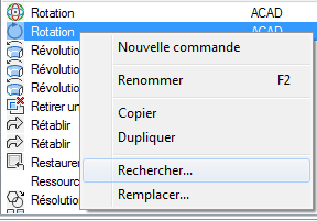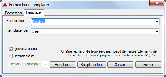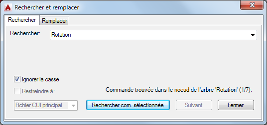 Un message s'affiche, détaillant l'emplacement de la commande, sa position exacte dans le volet Personnalisations dans ou Propriétés, ainsi que le nombre d'occurrences de la commande.