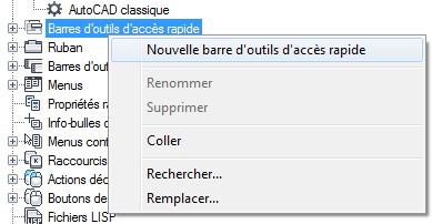 Une nouvelle barre d'outils d'accès rapide (appelée Barre d'outils d'accès rapide1) est placée en bas du noeud Barres d'outils d'accès rapide.