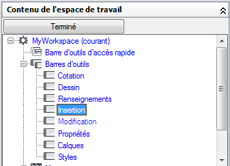 - Dans le volet Contenu de l'espace de travail, cliquez sur le signe Plus (+) en regard du noeud Barres d'outils pour le développer.