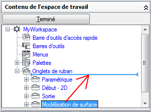 - Dans le volet Contenu de l'espace de travail, cliquez sur le signe plus (+) en regard du nœud Onglets de ruban pour le développer.