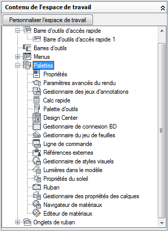 - Dans le volet Contenu de l'espace de travail, cliquez sur le signe plus (+) en regard du noeud Palettes pour le développer.