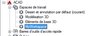 - Dans le volet Personnalisations dans <nom de fichier> de l'onglet Personnaliser, cliquez sur l'espace de travail contenant la barre d'outils à modifier.