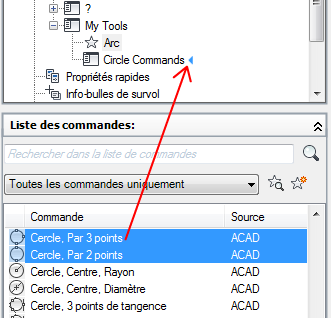 7. Dans le volet Liste des commandes, faites glisser la commande que vous voulez ajouter au sous-menu dans le volet Personnalisations dans <nom de fichier>.