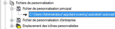 - Dans l'Explorateur Windows ou l'Explorateur de fichiers, accédez à l'emplacement suivant : <lecteur>:\Users\<nom du profil utilisateur>\AppData\Roaming\Autodesk\<nom du produit>\<numéro de version>\<langue>\support\<nom du fichier de personnalisation>.cuix