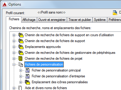 - Dans l'onglet Fichiers de la boîte de dialogue Options, cliquez sur le signe plus (+) situé à côté de Fichiers de personnalisation pour développer le noeud.