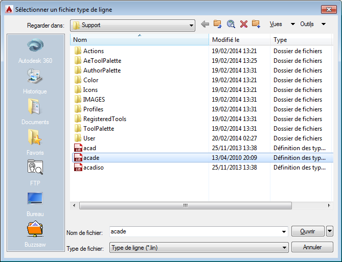 Dans la boîte de dialogue Sélectionner un fichier type de ligne, sélectionnez acade.lin et cliquez sur Ouvrir.