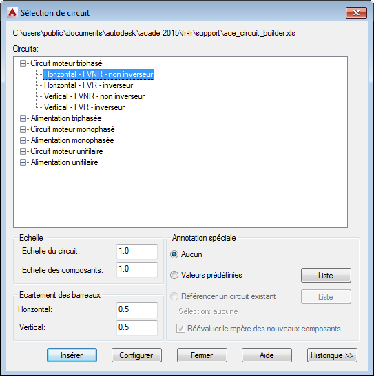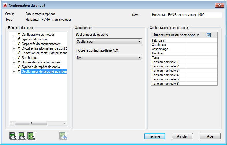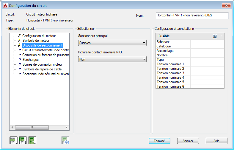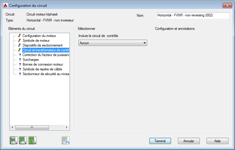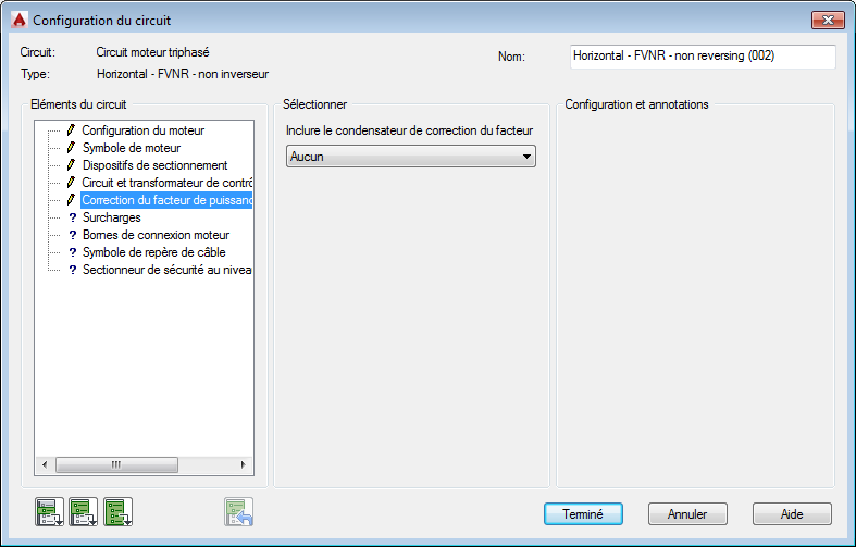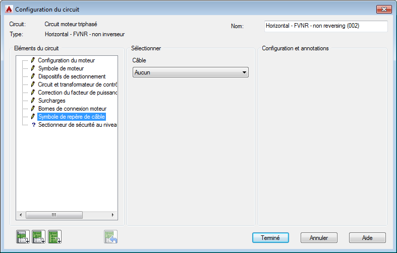 Section Configuration et annotation: Les options contenues dans cette section changent en fonction des sélections que vous effectuez dans les sections Eléments du circuit et Sélection. Entrez les valeurs ou sélectionnez le bouton Parcourir pour accéder à une table de recherche.