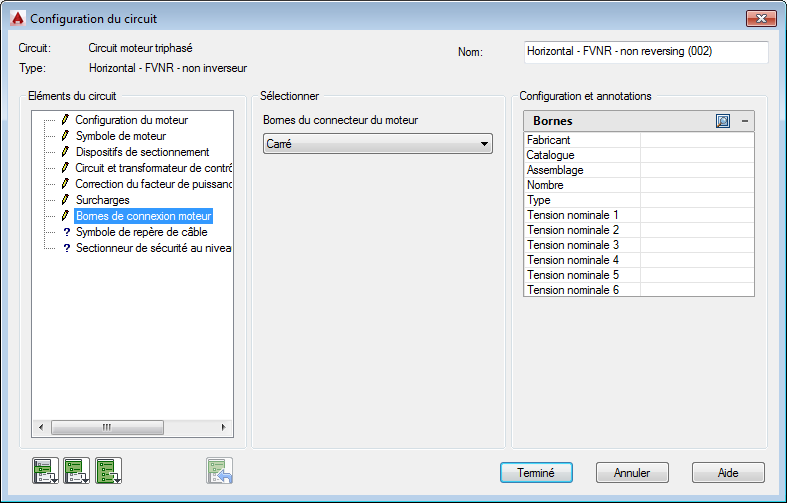 Dans la section Sélection, sélectionnez Bornes de connexion du moteur: Rond.
