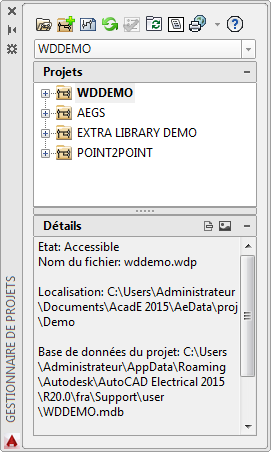 AutoCAD Electrical est un système basé sur les projets. Un texte ASCII avec une extension .wdp définit chaque projet. Ce fichier de projet contient une liste d'informations sur le projet, les paramètres par défaut du projet, les propriétés des dessins et les noms de fichier des dessins. Vous pouvez posséder un nombre illimité de projets mais un seul projet peut être actif à la fois.