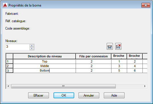 Remarquez dans la boîte de dialogue Insérer / Modifier le symbole de borne, section Propriétés/Associations, que le bloc a désormais trois niveaux. La borne 4 est affectée au niveau supérieur du bloc.