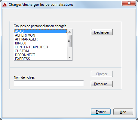 Spécifie le fichier à charger si vous cliquez sur Charger. Vous pouvez entrer le nom du fichier ou cliquer sur Parcourir pour afficher la boîte de dialogue Sélectionner un fichier de personnalisation (boîte de dialogue standard de sélection de fichiers).