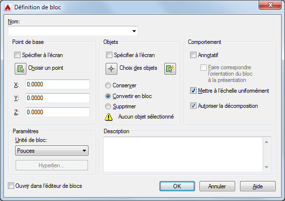 Désigne les objets à insérer dans le nouveau bloc et détermine si les objets sélectionnés doivent être conservés, supprimés ou convertis en occurrence de bloc une fois le bloc créé.