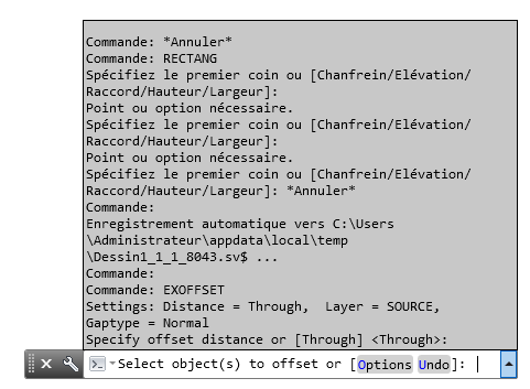 Répéter la séquence de commandes précédente | Sélectionnez la séquence et appuyez sur les touches Ctrl+C. Sur la ligne de commande, appuyez sur les touches Ctrl+V. |