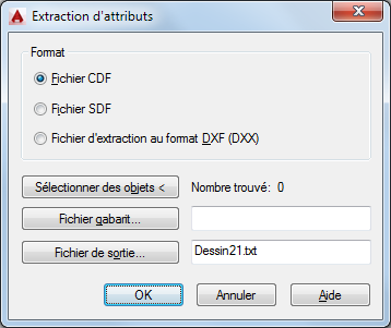 Spécifie le format de fichier des informations d'attribut, les objets à partir desquels vous voulez extraire des informations, ainsi que les noms du gabarit et du fichier de sortie.