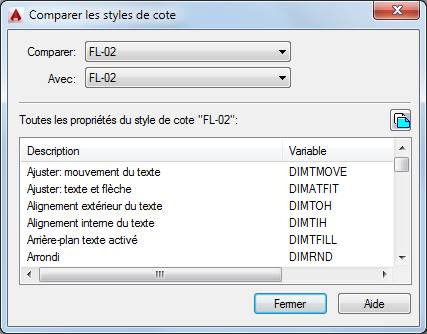 Affiche les résultats de la comparaison des styles de cote. Si vous comparez deux styles différents, les propriétés qui diffèrent s'affichent. Si vous définissez le deuxième style sur <aucun> ou sur le même style que le premier, toutes les propriétés du style de cote s'affichent.