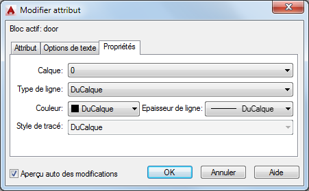 Définit le calque sur lequel repose l'attribut, ainsi que la couleur, l'épaisseur et le type de ligne associés. Si le dessin utilise des styles de tracé, vous pouvez en associer un à l'attribut via l'onglet Propriétés.